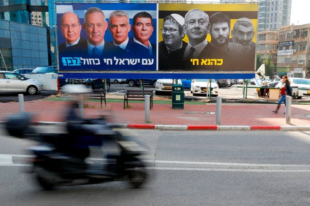 A billboard in Ramat Gan showing the Blue and White leaders Moshe Yaalon, Benny Gantz, Yair Lapid and Gabi Ashkenazi alongside a billboard showing Prime Minister Benjamin Netanyahu flanked by the extreme-right politicians Itamar Ben Gvir, Bezalel Smotrich and Michael Ben Ari. Credit Ack Guez/Agence France-Presse — Getty Images