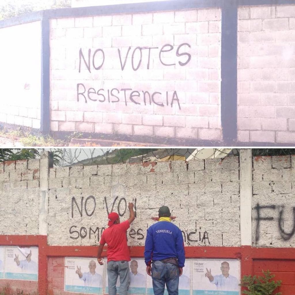 Desde hace varias semanas, en redes sociales como Facebook y Twitter numerosas falsas publicaciones y mensajes de presuntos opositores (muchos con identidades usurpadas) llaman a los electores venezolanos a no votar en las elecciones regionales del próximo domingo. Por otro lado, este lunes muchas calles de Caracas amanecieron manchadas con grafitis que invitan a no votar, firmados por una presunta “Resistencia” (denominación usual y auto asignada del sector radical de la oposición democrática); también han sido publicadas fotografías de vehículos y personal de la Alcaldía del Municipio Libertador (en manos del partido de gobierno) dedicados a tan abusivo menester de lesa estética urbana.