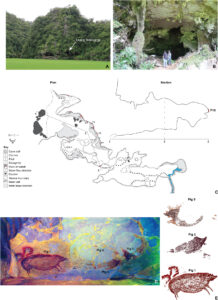 La imagen del cerdo de Leang Tedongnge parecería una prueba de la presencia del Homo sapiens en Wallacea. La edad mínima de esta pintura es de 44.600 años. Los expertos no tienen la certeza de que la representación de arte rupestre figurativo de las cuevas de Leang Tedongnge sea obra del hombre moderno; sin embargo, la complejidad de lo que se ha encontrado hace difícil pensar que no lo sea. La pintura de animales que se encuentra en la pared de la cueva Leang Bulu’Sipong, en el sur de Sulawesi, en Indonesia, tiene al menos 44.000 años y se dice que es la historia retratada más antigua del mundo, pues la pintura describe criaturas, en parte humanas y en parte animales, cazando un búfalo. Estas figuras sostienen lanzas y cuerdas, y hay también cerdos salvajes.