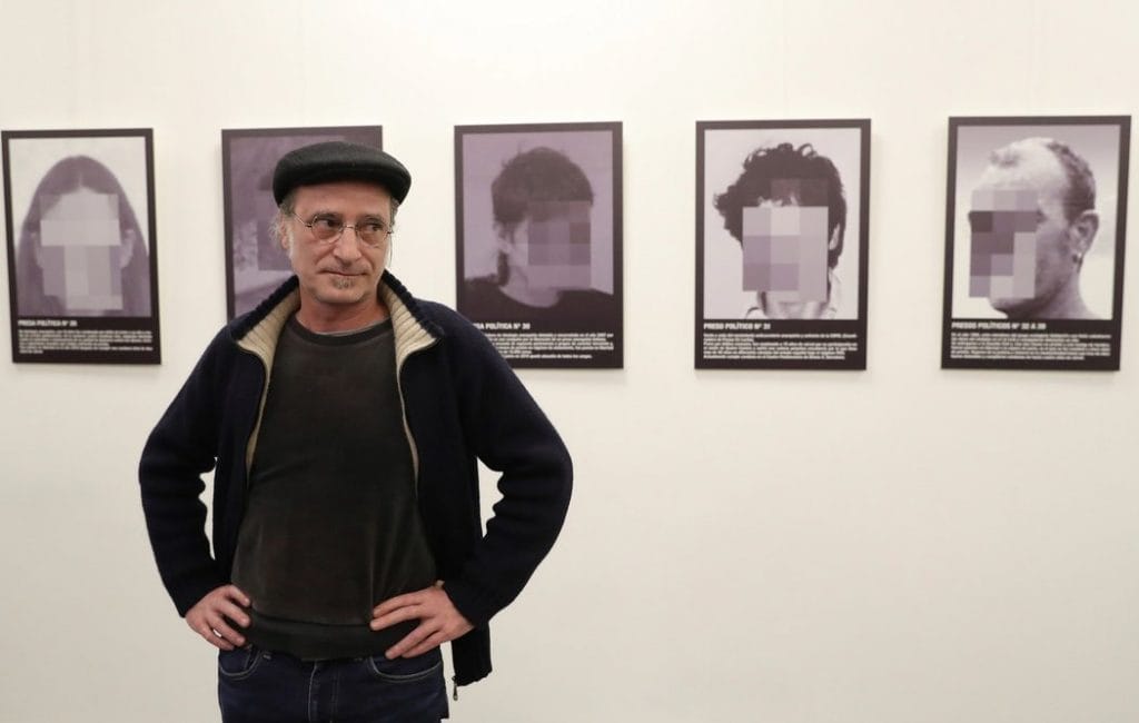 El artista español Santiago Sierra posa frente a su obra ‘Presos políticos’ antes de asistir a un debate en Madrid, España, con motivo de la eliminación de la obra de la Feria Internacional de Arte Contemporáneo ARCO. Credit Ballesteros/European Pressphoto Agency