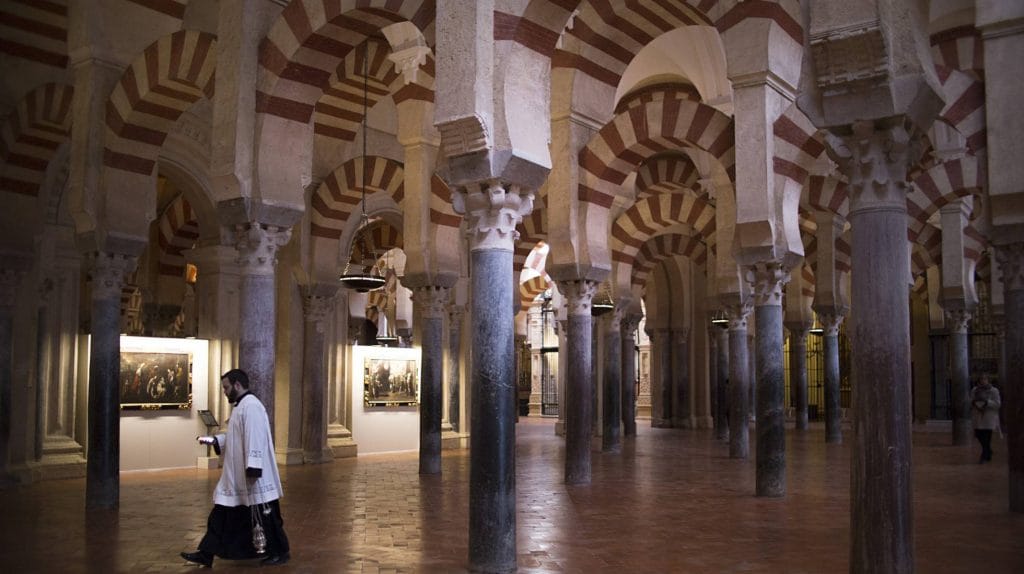 Un monaguillo bajo los arcos bicolor de la Mezquita de Córdoba. PACO PUENTES