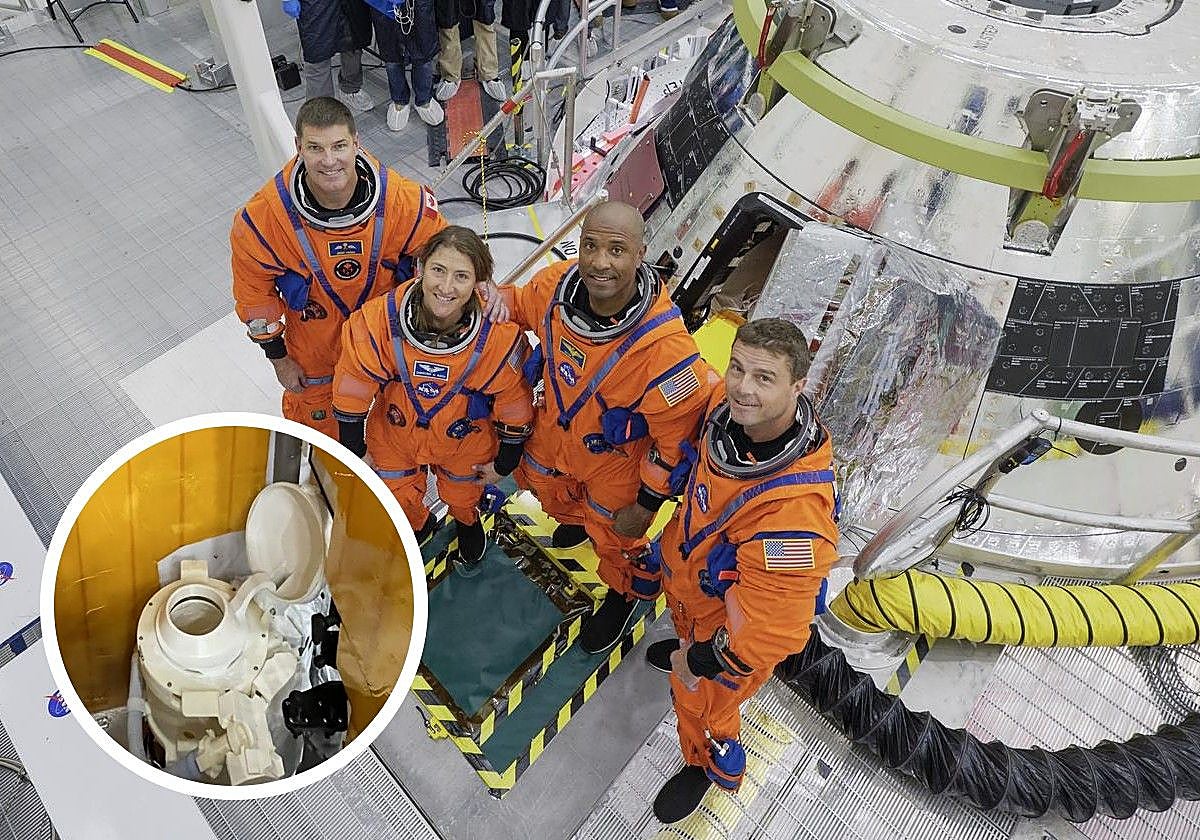 Los cuatro astronautas de Artemis II junto a la nave Orión. En el detalle, el baño que usarán durante la misión. (NASA)