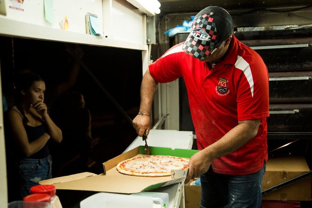 El toque de queda comenzó hace hora y media, pero la plaza principal de Ponce está repleta de gente. Está en oscuridad casi total. Una mujer grita a través de un megáfono, se escucha la música y la gastroneta de Toñito’s Jr. Pizza atiende a los clientes: solo vende la pizza completa. Un policía se recarga en un poste de luz apagado para ver todo en oscuridad, despreocupado por las violaciones a la ley.
