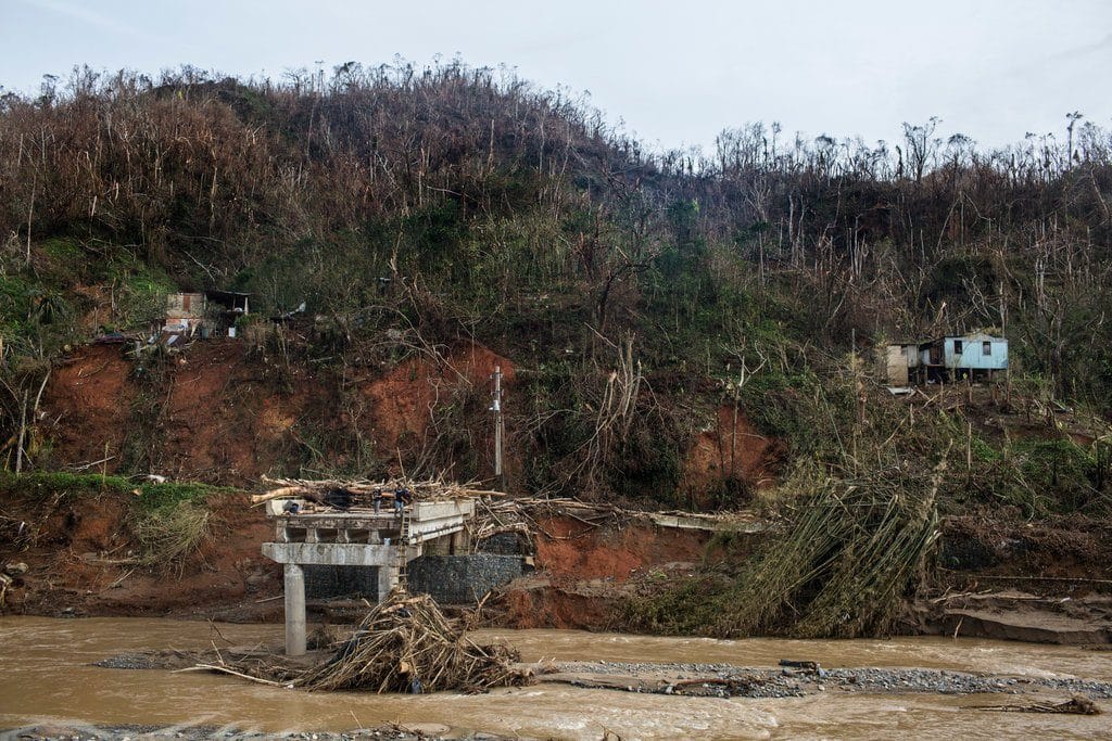 En el campo, en la ribera oeste del río Viví, la parte restante de un puente destruido por el huracán María sobresale violentamente hacia el este, como una promesa rota.