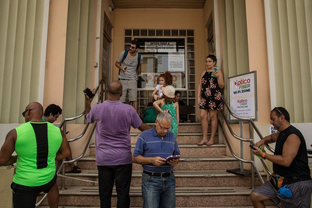 Decenas de personas revisan sus teléfonos frente a la fachada art déco verde y rosa del edificio El Telégrafo en Santurce. Esa sección de la calle es uno de los pocos lugares de la isla donde los habitantes pueden tener wifi gratis.