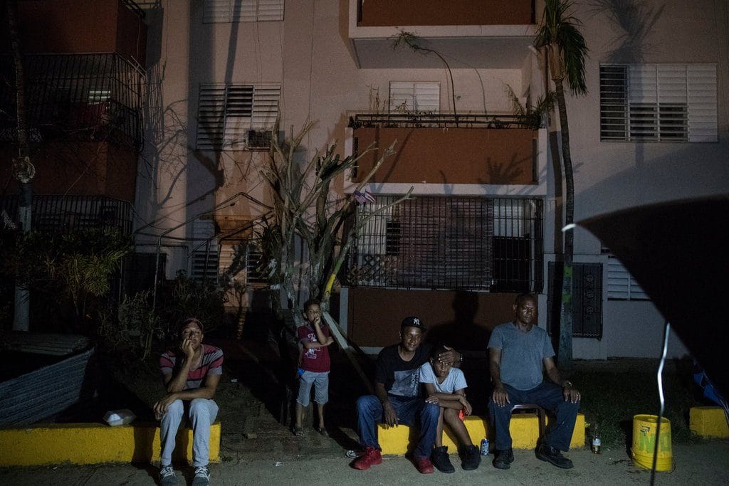 Habitantes del residencial Luis Llorens Torres ven un televisor conectado a un acumulador de auto en San Juan el miércoles.