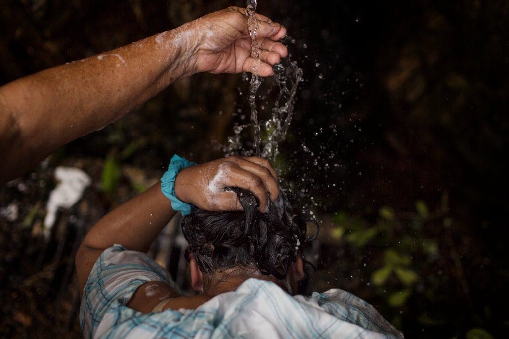 Algunos hombres treparon la pendiente de la colina para colocar tubos de plástico o viejas piezas de desagüe bajo el manantial, con lo que dirigieron el agua hacia enormes tanques de plástico y, posteriormente, se los llevaron. Otros se agacharon en un punto donde gotea hacia el pavimento. Jorge Díaz Rivera, de 61 años, estaba ahí con once botellas de cloro; vive en una comunidad ubicada a unos cuantos minutos en auto, donde no hay agua ni alimento ni ayuda. Los helicópteros de la Guardia Nacional han sobrevolado y, a veces, él y sus vecinos les gritan, suplicando por agua. Pero hasta el momento no ha recibido ayuda.