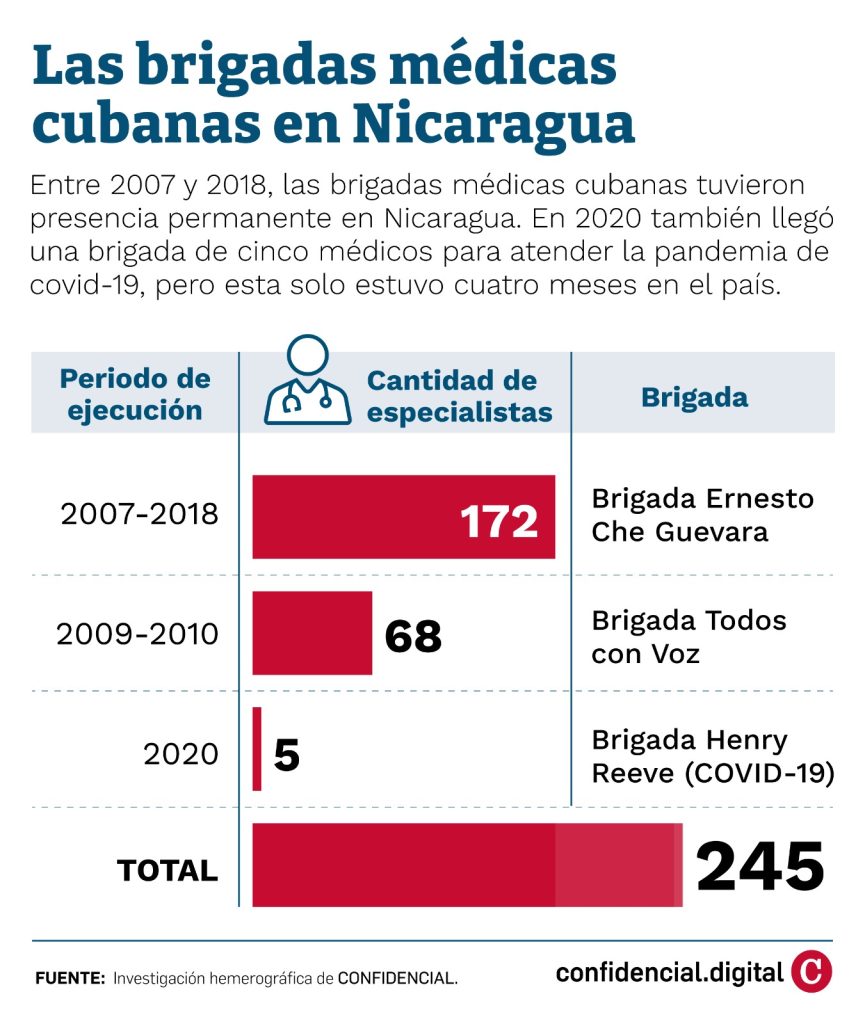 Contrario a los países del norte de Centroamérica, Nicaragua —que se jacta de ser un aliado de Cuba en la región— no tiene brigadas médicas cubanas en su territorio desde 2018. Desde 2007, la isla envió al país aproximadamente 245 galenos y contribuyó a la formación de alrededor de 1700 médicos nicaragüenses a través de la Escuela Latinoamericana de Medicina (ELAM).