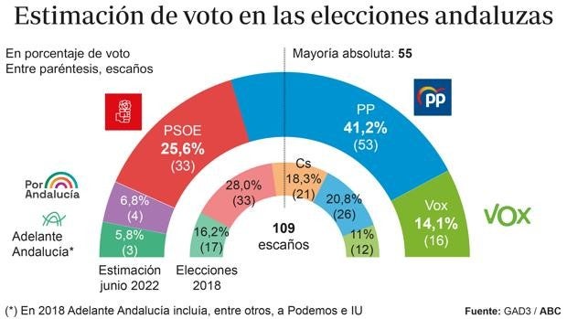 El umbral de la mayoría absoluta está en los 55 diputados en un Parlamento con 109 asientos. De celebrarse hoy las elecciones, el PP sacaría más del doble de los diputados que en los anteriores comicios del 2 de diciembre de 2018 (26 representantes y el 20,8% de apoyos), en los que Susana Díaz se llevó la victoria, pero sacó los peores resultados de la historia para su partido. Por primera vez las derechas (PP, Ciudadanos y Vox) sumaban más que las izquierdas, lo que provocó que los socialistas fueran desalojados del Palacio de San Telmo, la sede de la Presidencia autonómica, donde habían estado cómodamente instalados durante casi 37 años consecutivos desde la Transición.