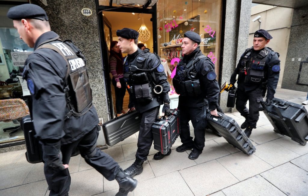 Policías antes de allanar el hogar de la expresidenta Cristina Fernández de Kirchner en Buenos Aires, hace unas semanas. Credit Marcos Brindicci/Reuters