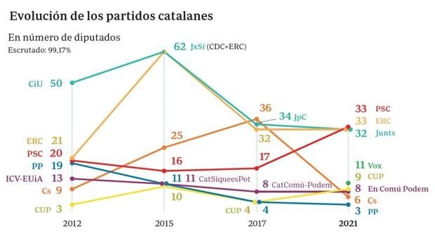 Pese a la victoria socialista, el independentismo seguirá controlando el Parlament, incluso de manera holgada frente a las estrecheces de su actual mayoría de 70 diputados. De manera muy ajustada, ERC le ganó la partida a Junts, o lo que es lo mismo, Junqueras rebasó finalmente a Puigdemont, logrando por fin, y aunque por los pelos, poco más de un punto de diferencia, el ansiado ‘sorpasso’ de ERC sobre su histórico rival.