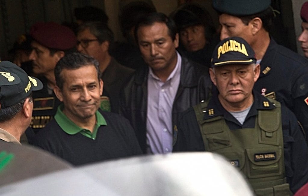 El ex-presidente de Perú Ollanta Humala es escoltado por policías a la cárcel de Diones, en Lima, donde también está preso el ex-presidente Alberto Fujimori. CreditMartín Mejía/Associated Press