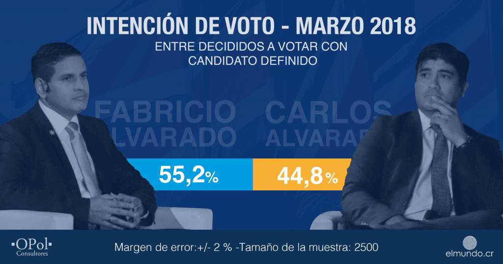Según los datos obtenidos en el estudio, Fabricio Alvarado, tiene una intención de voto del 55,2%, mientras el oficialista, Carlos Alvarado obtendría si las elecciones fueran hoy un 44,8%.