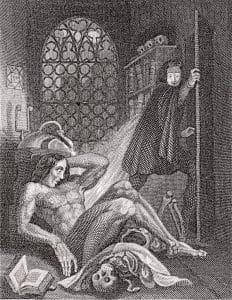 Litografía incluida en la tercera edición de la novela, en 1831, la primera que se editó en un solo volumen y la primera que incluyó la imagen de la Criatura.