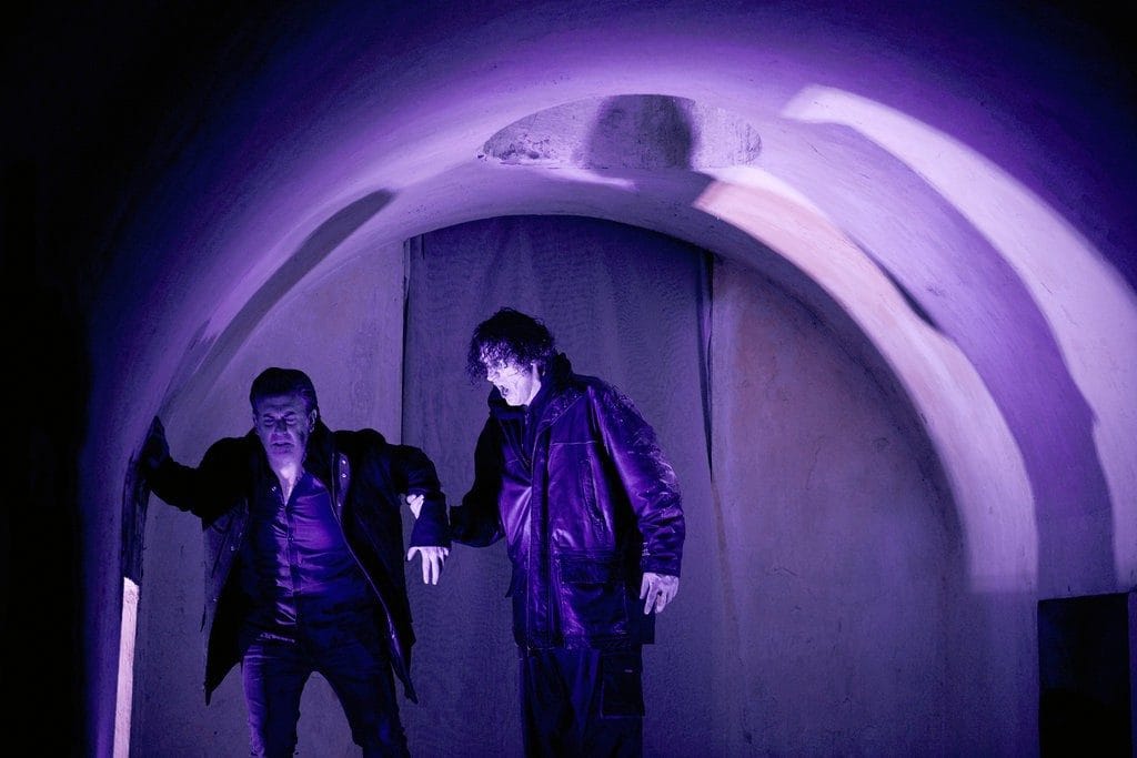 The monster (Joshua Jeremiah) attacks his creator (Brian Cheney) in a scene from «Sketches From Frankenstein,» a new piece by Gregg Kallor that was performed this month in the catacombs at Green-Wood Cemetery in Brooklyn. Credit Joe Carrotta for The New York Times