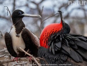 Entre las aves marinas destacan las Tijeretas de Mar, propias de océanos cálidos y con dimorfismo sexual. Son “ladronas por necesidad” porque carecen del aceite suficiente en sus plumas para impermeabilizarlas, por lo que no pueden sumergirse en el agua sin dificultad para volver a volar. Son excelentes planeadoras, aprovechan esa habilidad para acosar y robar comida a otras aves, y también capturan peces en la superficie o aprovechan restos dejados por pescadores. Su cortejo es llamativo: el macho extiende las alas e infla un gran saco gular rojo para atraer a la hembra y luego hacer nido.
