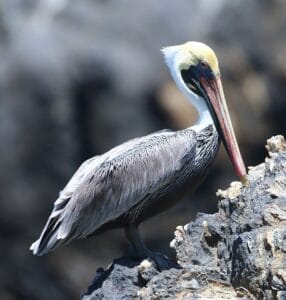 El Alcatraz es otra ave inconfundible, de gran tamaño, con un pico enorme en forma de bolsa y bolsa gular extensible. Presenta plumaje mayormente blanquecino y piel facial gris opaco, aunque en época reproductiva muestra tonos castaños rojizos contrastados con blanco y negruzco. Vuela en soberbia formación, con aleteos lentos y largos planeos, o a baja altura sobre aguas costeras, donde pesca pequeños peces flotando. En aguas profundas se zambulle con gran precisión y agilidad. Es residente común en toda la costa y anida en ramas, manglares o bordes de bosques.
