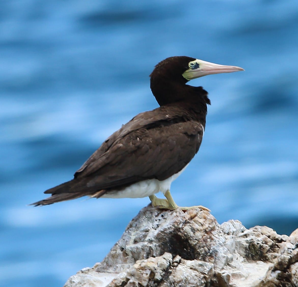 La Boba Marrón (66 a 76 cm). Tiene pico y patas amarillos, piel facial desnuda, partes superiores y cabeza marrón chocolate, y partes inferiores blancas. Vuela en líneas a baja altura y pesca sobre todo en aguas costeras poco profundas, donde es residente común. Habita en la costa y todas las islas de alta mar de Venezuela.
