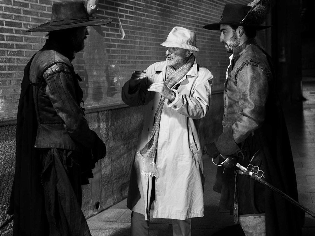 El capitán Alatriste regresa. Aquella noche, bajo las sombras de los soportales y las farolas mortecinas del viejo Madrid, su silueta cruzó fugaz las callejuelas empedradas, envuelta en su capa y su silencio acostumbrado, con la compañía de algún camarada. O de algún enemigo. Hace unas semanas, fuimos testigos privilegiados del rodaje de un corto (fruto del magnífico trabajo nocturno de las productoras Malapata y Krusel) que nos anunciaba su llegada. En esta ocasión, Alatriste tenía el rostro imponente del actor Xosé López, mientras que la sombra que cruzaba con él su acero era la del actor Mateo Franco, digno oponente, ambos dirigidos por Pablo Mediavilla.