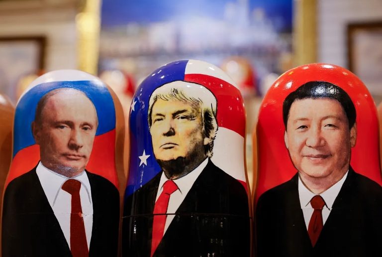 Tres tradicionales matrioskas con las imágenes de Vladimir Putin, Donald Trump y Xi Jinping. | Foto: EFE/Archivo