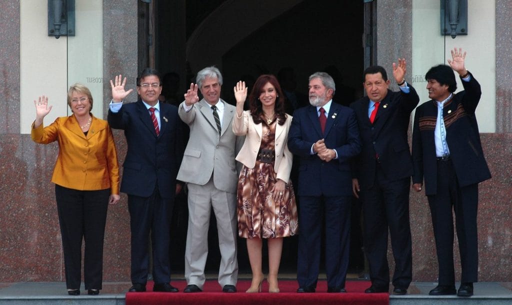 En 2007, un año antes de la creación de la Unasur, los entonces mandatarios Michelle Bachelet de Chile, Nicanor Duarte de Paraguay, Tabaré Vázquez de Uruguay, Cristina Fernández de Kirchner de Argentina, Luiz Inácio Lula da Silva de Brasil, Hugo Chávez de Venezuela y Evo Morales de Bolivia asistieron a la reunión del Mercosur. Credit Mariana Méndez/Agence France-Presse — Getty Images