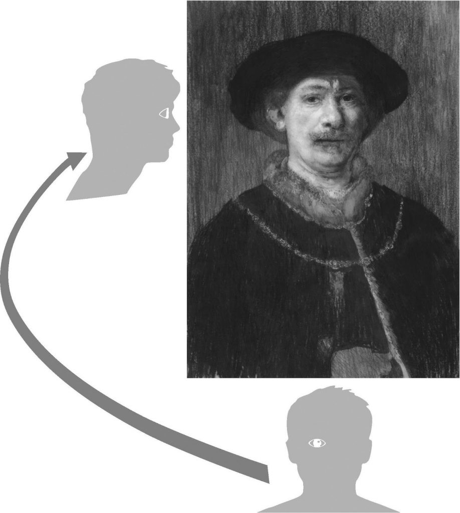 En este caso, el acto de fe que voy a pedir requiere poco trabajo (pero hay que hacerlo para no abandonar ya la fiesta). Solo tenemos que ir desplazándonos a nuestra izquierda hasta que consigamos que los ojos de Rembrandt se crucen con los nuestros, esperando que, cuando eso ocurra, lo notaremos (Figura 2).