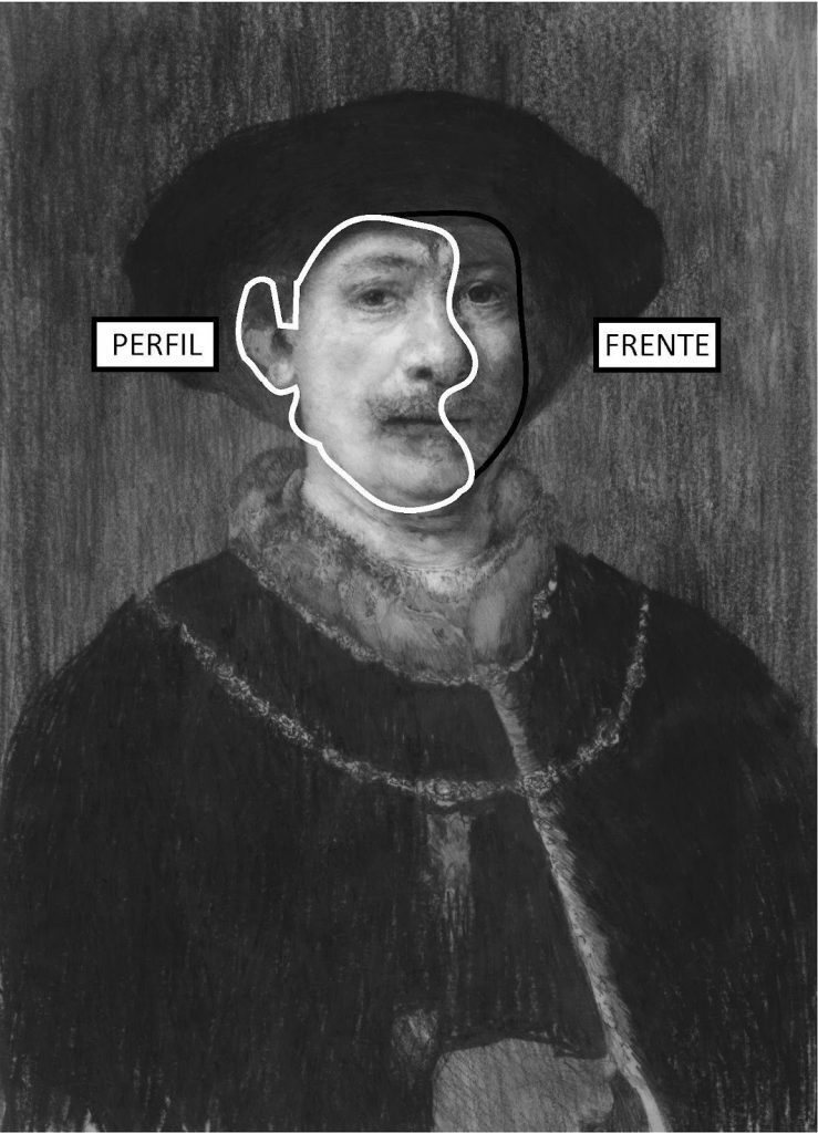 Pero esa mirada suya viene y se va. La encontramos y la volvemos a perder. Parece que cada ojo mira en una dirección ligeramente diferente. Miras un ojo, miras el otro, miras a los dos a la vez. Parece que el ojo más alejado, en el perfil a oscuras, nos está mirando de frente. Y que el más cercano, a la luz, nos mira de perfil, casi desde el rabillo del ojo. Si tapamos cada perfil lo veremos claramente (Figura 4).