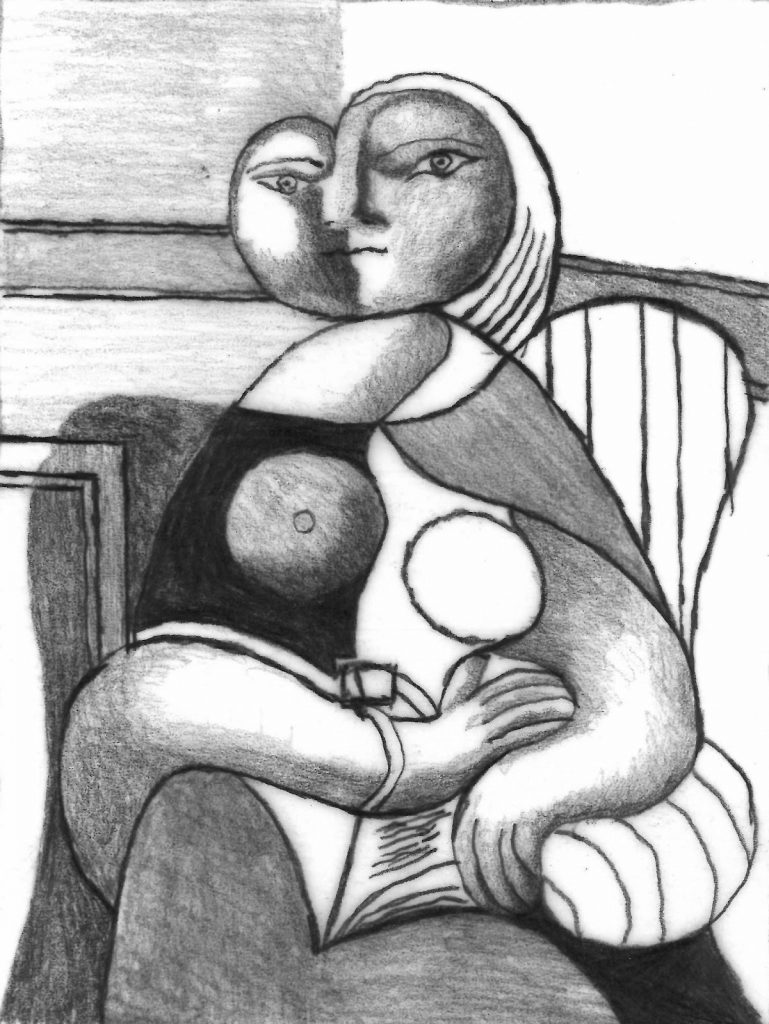 El del Prado lo pinta doce años después de El escultor y la idea estaba entonces muy fijada. Es una variación sobre la idea inicial. Son momentos distintos, en el primero ha encontrado algo, en el segundo continúa buscando. Sin embargo, en La lectura (Figura 7), del 2 de enero de 1932, no había pasado ni un mes desde El escultor y ya tenía la idea clara. Picasso pinta ideas, las sintetiza y las retuerce hasta conseguir que aparezca otra nueva. No las utiliza para seguirte con la mirada como hace Rembrandt.
