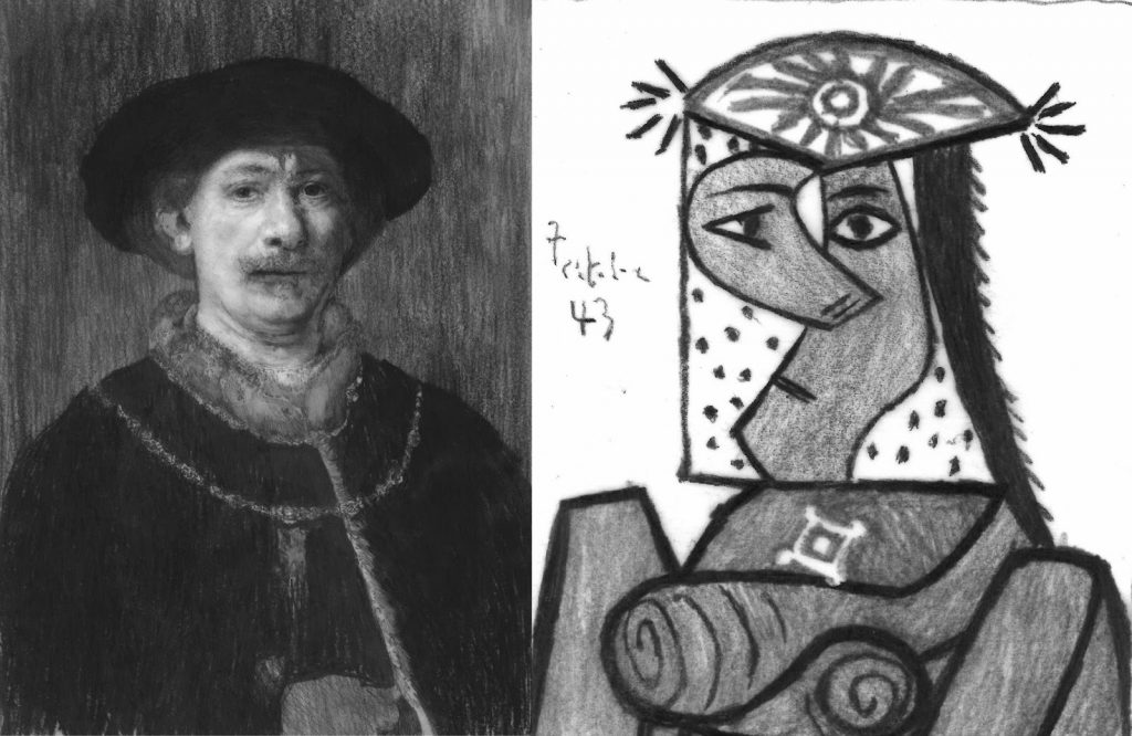 Pero El escultor lo pinta tres años antes. Es muy posible que, para entonces, ya hubiera estudiado cientos de Rembrandts. Además, la cara que dibuja Picasso en Rembrandt y tres cabezas de mujer es del mismo estilo, redonda, como estirada por los lados. Muy similar a las que dibuja el propio Rembrandt en sus grabados, donde experimenta con estas caras por primera vez, mirando de frente y de perfil. En sus aguafuertes es más fácil de ver incluso que en sus pinturas.