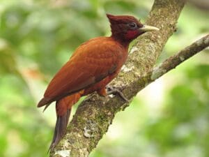 Entre ellos, el Carpintero Castaño: grande (28 cm.); de color castaño oscuro bastante uniforme. Buscan alimento especialmente en medio de bosques húmedos y con várzea; al Noreste de Venezuela, extendido en tierras bajas al sur del Orinoco.