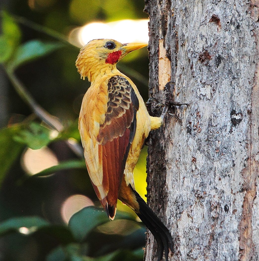 O el hermoso e inconfundible Carpintero Amarillo de color gamuza con cresta tupida y descuidada, ojos negros prominentes y pico amarillento. Solo o en grupos ruidosos y llamativos, busca alimento principalmente en los niveles medios y superiores de los árboles