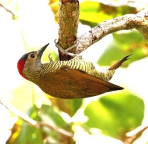 El Carpintero Dorado Verde es el más común de ellos: con su manto de color dorado oliva y resaltante máscara blanca en la cara. Solo o en grupos, desde alturas bajas hasta el sotobosque, golpea y escarba ramas, lianas y troncos erguidos y desnudos.