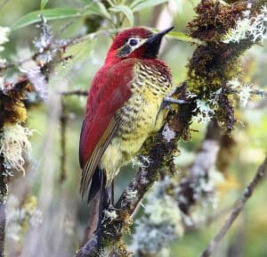 El Carpintero Candela es espectacular; su parte superior es casi completamente escarlata brillante. Solitarios o en parejas buscan alimento a cualquier altura, más frecuentemente en lo alto de los árboles; en bosques. húmedos y musgosos en zonas bajas de páramo (1800-3700 m)