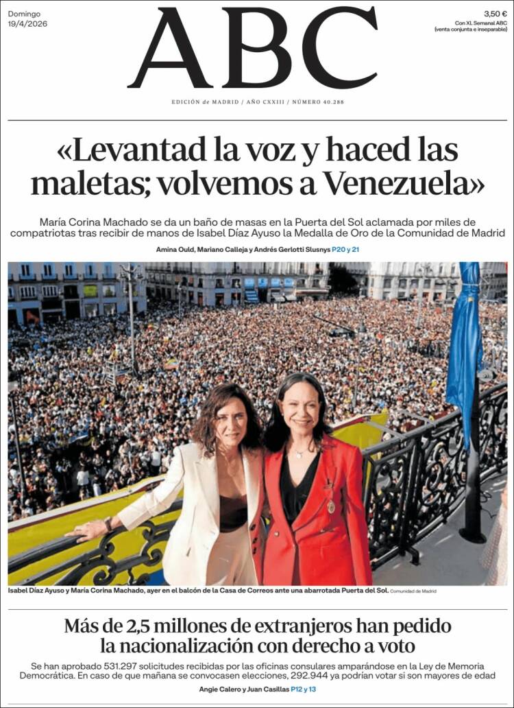 Los principales diarios de España destacaron en sus portadas del domingo la concentración en la Puerta del Sol y la entrega de la Medalla de Oro de la Comunidad de Madrid a la líder opositora venezolana
