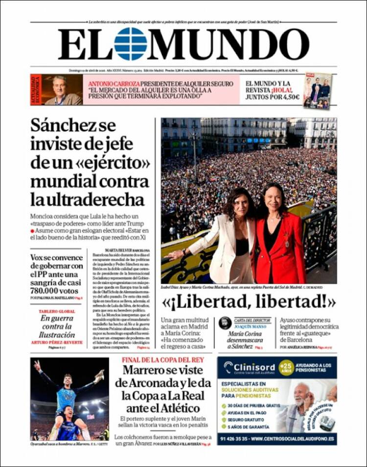 Por su parte, El Mundo centró su cobertura en el ambiente vivido en la Puerta del Sol con el titular “¡Libertad, libertad!”. Además, acompañó el artículo con imágenes del respaldo popular a la dirigente y del acto junto a Díaz Ayuso. Esto sucedió en una de las postales más difundidas del fin de semana político en España.