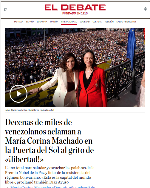 El diario ABC llevó el evento a sus páginas con una de las frases centrales del discurso: “Levantad la voz y haced las maletas; volvemos a Venezuela”, destacando el tono movilizador del mensaje pronunciado por Machado ante la diáspora venezolana.
