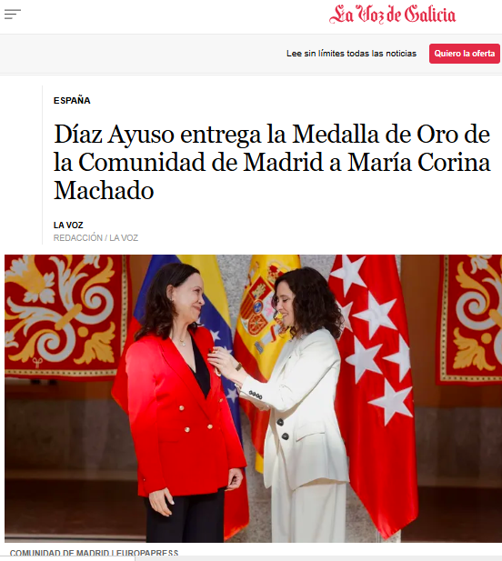 De igual manera, La Voz de Galicia dedicó su espacio informativo a la entrega de la distinción. Además, subrayó la relevancia del acto político realizado en la sede del gobierno madrileño.