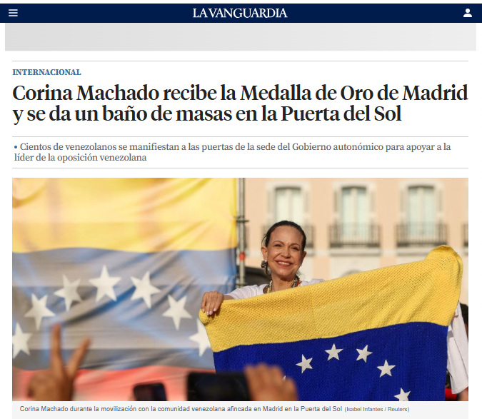 En Cataluña, La Vanguardia informó sobre el acto bajo el titular “Corina Machado recibe la Medalla de Oro de Madrid y se da un baño de masas”. Así, resaltó la dimensión política de la jornada y la movilización de la comunidad venezolana en el exterior.
